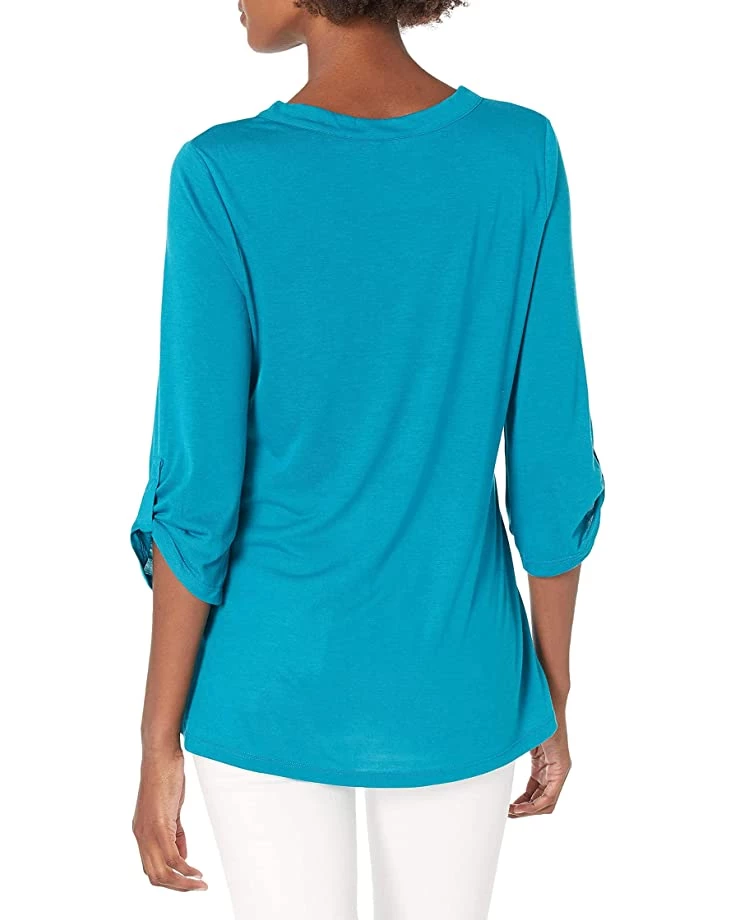 I have several of these rolled sleeve tunics, in different colors. The lightweight fabric gives a flattering fit. These tops are a basic for my casual wardrobe.
